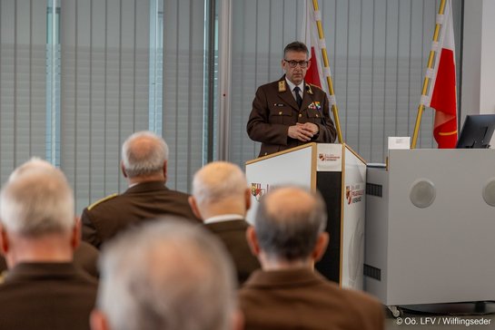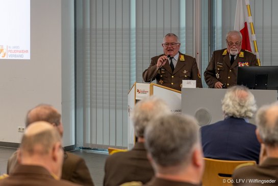 Landesfeuerwehrkommandant Feuerwehrpräsident Robert Mayer, MSc begrüßte uns im Mehrzwecksaal der Landes-Feuerwehrschule sehr herzlich. Er sagte, dass das Jahr 2025 ein sehr bewegtes Jahr war, jedoch einsatzmäßig eher ruhiger war aber die Arbeitsaufwands-stunden gleich gegenüber den letzten Jahren waren. Es muss rund um die Feuerwehr sehr viel geleistet werden, damit Feuerwehr in Österreich und Öberösterreich funktioniert. Er gab der Freude Ausdruck, dass heute so viele Kameraden zu diesem Treffen gekommen sind, ihr die ehemaligen Führungskräfte seid ja jahrzehntelang Wegbereiter und Wegbegleiter gewesen.