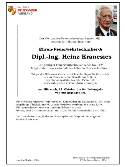 Ehren-Feuerwehrtechniker-A (A steht für Akademiker). Geboren 1930 in Wien. 1977 Eintritt in die FF Gallneukirchen, wurde 1978 Oberamtswalter des Abschnittes Urfahr-Umgebung, von 1982 bis 1993 hat er im Landes-Kommando Vorträge gehalten. – Sein Großvater war Stadtbaumeister in Baden, sein Vater Beamter des Rechnungshofes, 1945 wurde die Familie von den Russen aus ihrer Villa gejagt. In die ist der sowjetische Hochkommissar Generaloberst Scheltow eingezogen. Die Familie musste sich mehrmals eine Bleibe suchen, weil sie wiederholt von der Besatzungsmacht ausquartiert wurde. Der Hunger veranlasste den Vater, den 15jährigen Oberschüler in die Obhut eines Bauern in Schönau zu entlassen. Aus dem Gymnasiasten wurde ein Knecht, der gegen den Willen seines Vaters darauf bestand, ein Landwirt zu werden. Der Vater knüpfte daran eine Bedingung: zuerst die Matura! Nach der Matura studierte er an der Boku, um Gutsverwalter werden. Am Ende verschlug es ihn nach Oberösterreich. 1969 bewarb er sich bei der „Sozialversicherung der Bauern“. Das bedingte eine Fachprüfung, die schlimmer als drei Staatsprüfungen war. Krancsics wurde Leiter der Unfallverhütungsstelle, dabei kam er mit der Feuerwehr in Kontakt. Bei diesem „Verein“ ist er dann hängen geblieben.